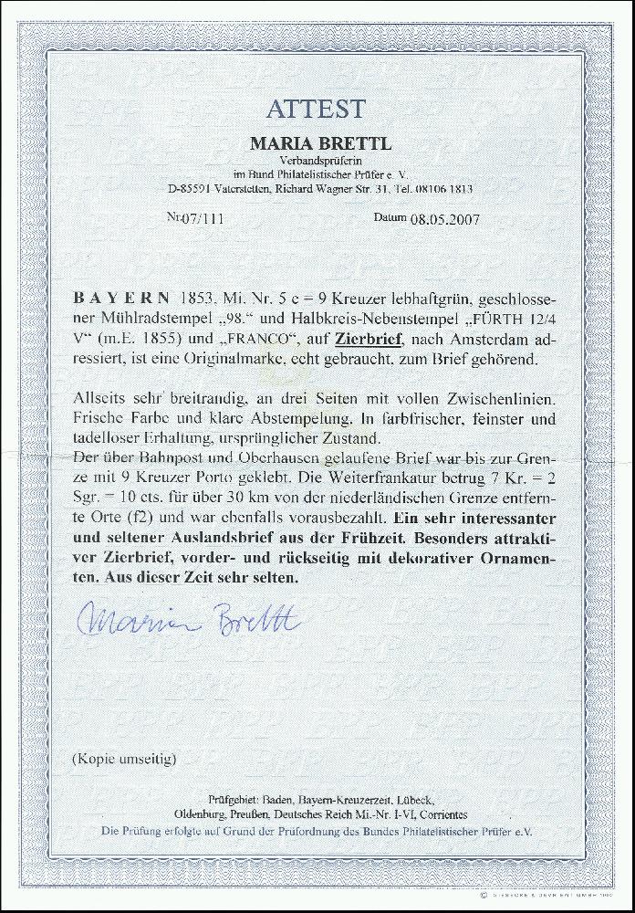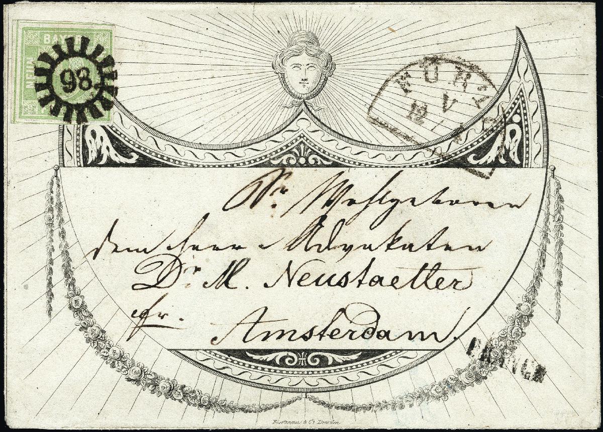 | Zusatzinformationen und Suchstichworte: | 377. Auktion Heinrich Köhler 20. - 25. September 2021 Los 9048 1850/58, 9 Kreuzer lebhaftgrün, sehr schön farbfrisch und allseits sehr breitrandig mit vollen Zwischenlinien an 3 Seiten, mit sauber übergehend aufgesetztem gMR "98" und nebengesetztem Halbkreis "FÜRTH 12/4" auf prachtvollem, vorder- und rückseitig mit Biedermeiermotiven bedrucktem Zierumschlag nach Amsterdam mit Transit- und Ankunftsstempeln. Der Brief ist bis zum Bestimmungsort mit 16 Kreuzern bezahlt; das Weiterfranko als "2" Silbergroschen bzw. "10" Cent rückseitig notiert; eine vorderseitige Franco-Notiz "2" wurde wahrscheinlich aus ästhätischen Gründen radiert. Sehr schöne und sonst tadellose Erhaltung. Ohne Zweifel einer der schönsten Zierbriefe Bayerns und als Auslandsbrief mit 'geteiltem Franko' unübertrefflich. Fotoattest Stegmüller BPP (2021) Zuschlag 10.500,00 EUR |