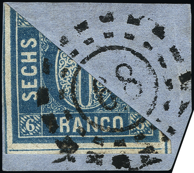 | Zusatzinformationen und Suchstichworte: | 377. Auktion Heinrich Köhler 20. - 25. September 2021 Los 9065 1862, 6 Kreuzer blau diagonal halbiert, linke untere Hälfte, farbfrisch und sehr breitrandig mit vollen Zwischenlinien mit glasklar übergehend aufgesetztem oMR "68" BURGKUNSTADT auf Briefstück. Ein sehr attraktives Stück in tadelloser Erhaltung. Signiert Hartmann und Pfenninger, Fotoattest Brettl BPP (1978) Zuschlag 1.900,00 EUR |