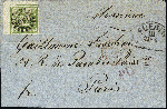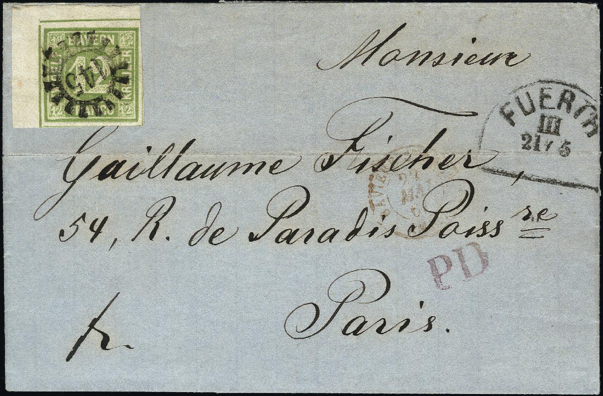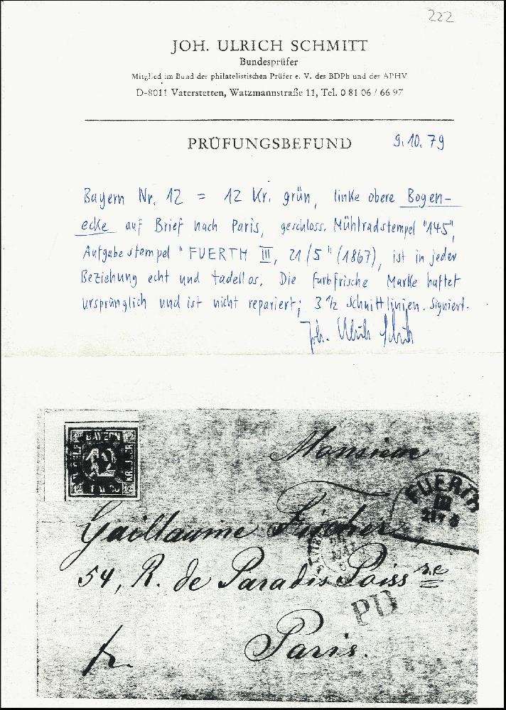 | Zusatzinformationen und Suchstichworte: | 377. Auktion Heinrich Köhler 20. - 25. September 2021 Los 9069 1862, 12 Kreuzer grün, linke obere Bogenecke, farbfrisch und allseits breitrandig, unten und rechts unten mit Zwischenlinien, links und oben mit ca. 5/3 mm Bogenrand, mit zentrisch und klar aufgesetztem gMR "145" und sauber nebengesetztem Halbkreis "FÜRTH 21/5" (1876) auf Briefhülle nach Paris. Ein waagerechter Briefbug außerhalb der Frankatur ist links leicht gebrochen, sonst einwandfreie Erhaltung. Eine in dieser Form außerordentlich attraktive Einzelfrankatur. Signiert Schmitt BPP mit Befund (1979) Zuschlag 1.300,00 EUR |