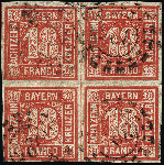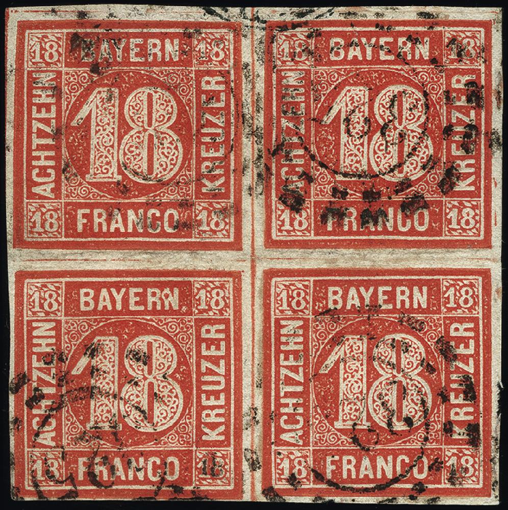 | Zusatzinformationen und Suchstichworte: | 377. Auktion Heinrich Köhler 20. - 25. September 2021 Los 9073 1862, 18 Kreuzer zinnoberrot im 4er-Block, farbfrisch und allseits voll- bis meist breitrandig, oben mit Zwischenlinie, leicht entwertet durch oMR "325" MÜNCHEN; schöne und einwandfreie Erhaltung (eine leichte waagerechte Knitterung zwischen den Marken unbedeutend). Postalisch gebrauchte Blockstücke dieser Marke sind außerordentlich selten; die Heinrich Köhler-Kartei hat nur einen weiteren, aber fehlerhaften 4er-Block registriert, darüber hinaus nur 3 größere Einheiten, davon eine stärker fehlerhaft. Fotoattest Brettl BPP (1986) Zuschlag 5.000,00 EUR |