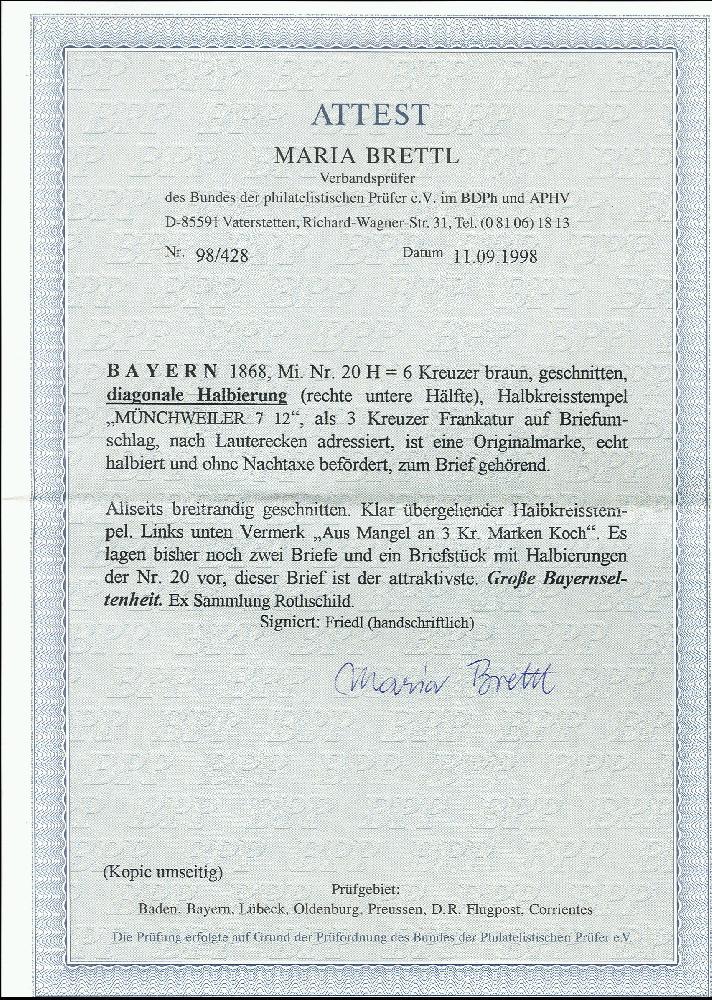 | Zusatzinformationen und Suchstichworte: | 377. Auktion Heinrich Köhler 20. - 25. September 2021 Los 9090 1868, Wappen 6 Kreuzer braun, diagonal halbiert, rechte untere Hälfte, farbfrisch und allseits breitrandig mit sauber auf- und nebengesetztem Halbkreisstempel "MÜNCHWEILER 7/12" auf dreiseitig geöffnetem Briefkuvert nach Lauterecken mit rückseitigem Ankunftsstempel vom gleichen Tag. Unterhalb der Marke ein gering übergehender handschriftlicher Vermerk "Aus Mangel an 3x Marken Koch" des Postmeisters. Ein kleiner Teil der Rückseite fehlend, sonst tadellose Erhaltung. Dieser Brief zählt zu den größten Kostbarkeiten der Bayern-Philatelie; von dieser Halbierung ist nur noch ein Briefstück und 2 Briefe aus Eggenfelden registriert, der hier vorliegende ist zweifellos der attraktivste. Ein in dieser Form einmaliges Stück. Signiert Friedl mit Attest (1949), Fotoattest Brettl BPP (1998) Zuschlag 38.000,00 EUR |
