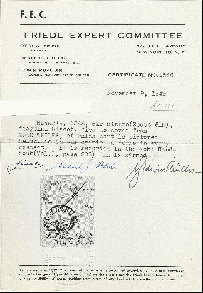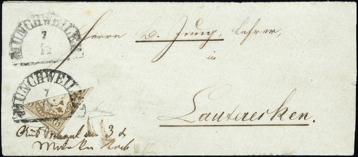 | Zusatzinformationen und Suchstichworte: | 377. Auktion Heinrich Köhler 20. - 25. September 2021 Los 9090 1868, Wappen 6 Kreuzer braun, diagonal halbiert, rechte untere Hälfte, farbfrisch und allseits breitrandig mit sauber auf- und nebengesetztem Halbkreisstempel "MÜNCHWEILER 7/12" auf dreiseitig geöffnetem Briefkuvert nach Lauterecken mit rückseitigem Ankunftsstempel vom gleichen Tag. Unterhalb der Marke ein gering übergehender handschriftlicher Vermerk "Aus Mangel an 3x Marken Koch" des Postmeisters. Ein kleiner Teil der Rückseite fehlend, sonst tadellose Erhaltung. Dieser Brief zählt zu den größten Kostbarkeiten der Bayern-Philatelie; von dieser Halbierung ist nur noch ein Briefstück und 2 Briefe aus Eggenfelden registriert, der hier vorliegende ist zweifellos der attraktivste. Ein in dieser Form einmaliges Stück. Signiert Friedl mit Attest (1949), Fotoattest Brettl BPP (1998) Zuschlag 38.000,00 EUR |