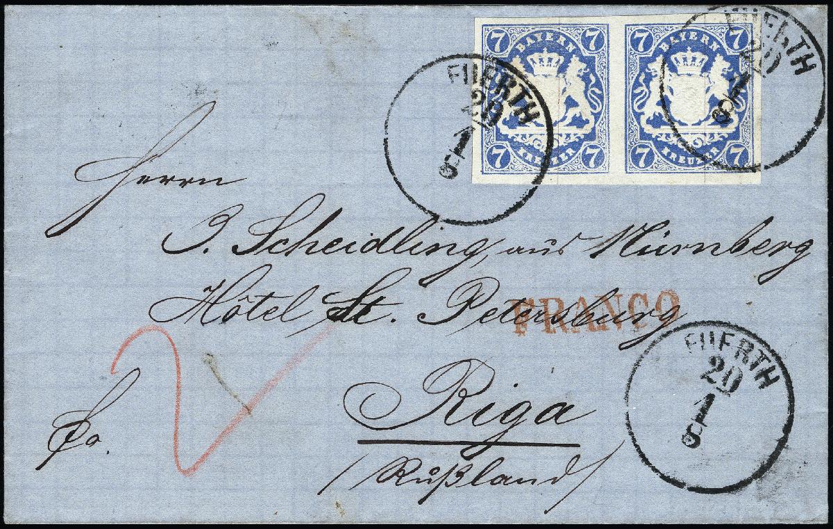 | Zusatzinformationen und Suchstichworte: | 377. Auktion Heinrich Köhler 20. - 25. September 2021 Los 9094 7 Kreuzer ultramarin (zu Preußischblau tendierend), allseits breitrandiges waagerechtes Paar in schöner leuchtender Farbe, mit sauber auf- und nebengesetztem Einkreisstempel "FUERTH 20/1" auf blauer Briefhülle über Preußen nach Riga mit Ankunftsstempel."2" Silbergroschen Weiterfranco vorderseitig vermerkt. Ein ebenso seltener wie attraktiver Brief in frischer und tadelloser Erhaltung. Fotoattest Sem BPP (2021). Zuschlag 3.600,00 EUR |
