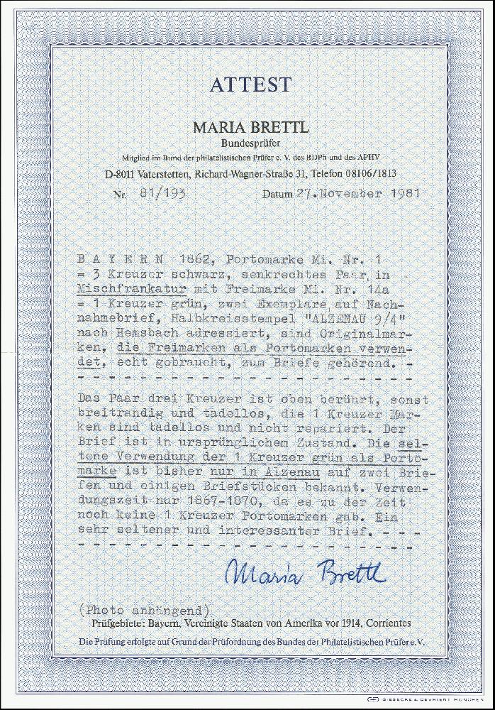 | Prüfgebiet: | Altdeutschland Bayern Portomarken |