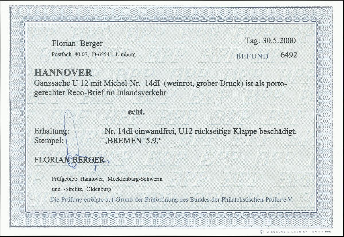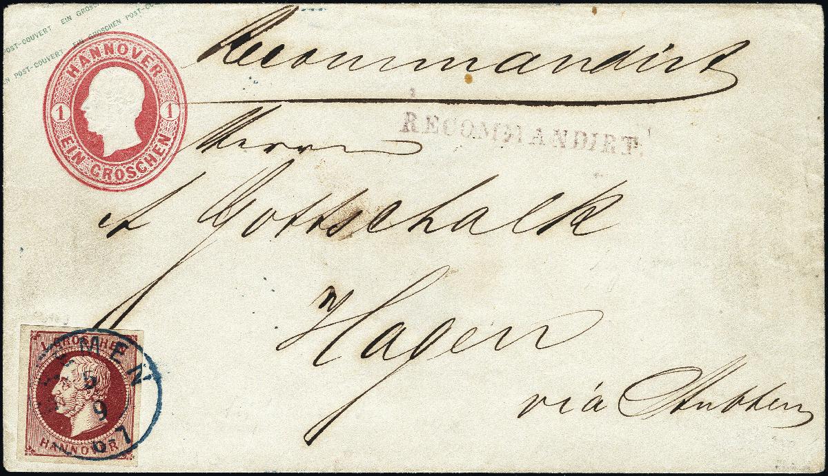 | Zusatzinformationen und Suchstichworte: | 377. Auktion Heinrich Köhler 20. - 25. September 2021 Los 9545 1859, Georg V. 1 Groschen weinrot, farbfrisch und allseits gut gerandet mit klarem EKr. "BREMEN 5 9" als Zufrankatur auf recommandiertem Ganzsachenumschlag 1 Groschen nach Hagen, tadellos, sign. Pfenninger sowie Befund Berger BPP (2000) Zuschlag 120,00 EUR |