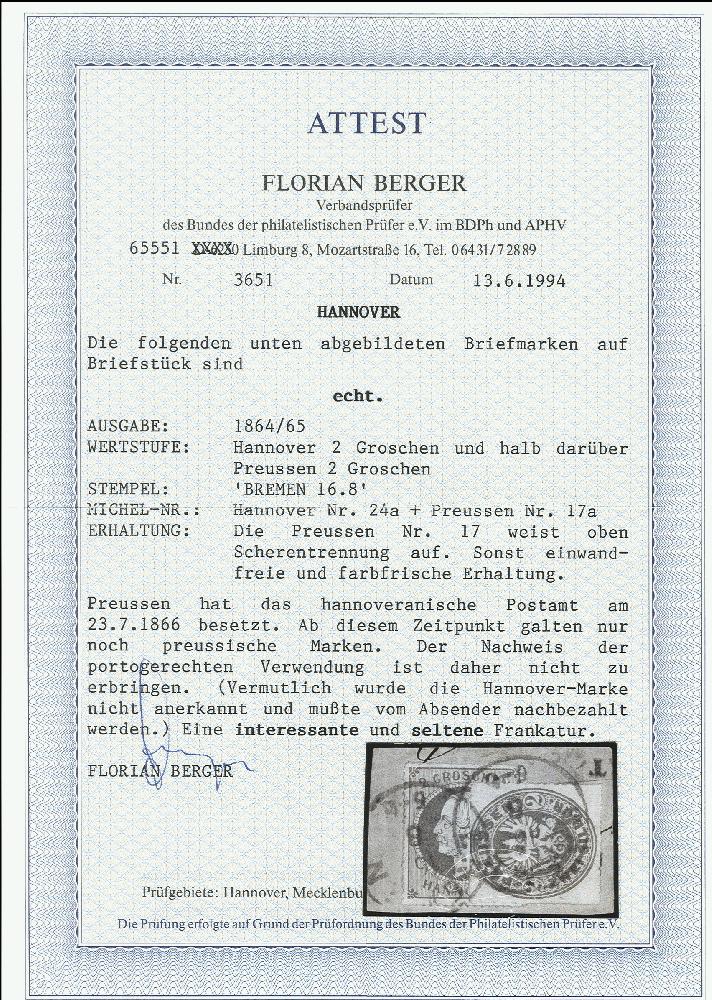 | Zusatzinformationen und Suchstichworte: | 377. Auktion Heinrich Köhler 20. - 25. September 2021 Los 9572 1864, Georg V., weißer Gummi, 2 Groschen blau zusammen mit Preußen Wappenausgabe 2 Groschen blau, je farbfrisch mit EKr. "BREMEN 16.8" auf kleinem Briefstück eines Reco-Briefes, die Preußen Marke eine Seite Scherentrennung, sonst tadellos, ein hochinteressantes Stück, wir haben aus Bremen kein weiteres registriert, u.a. sign. Fulpius mit Fotoattest (1952) sowie Fotoattest Berger BPP (1994) Zuschlag 480,00 EUR |