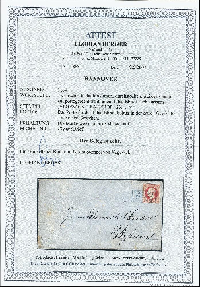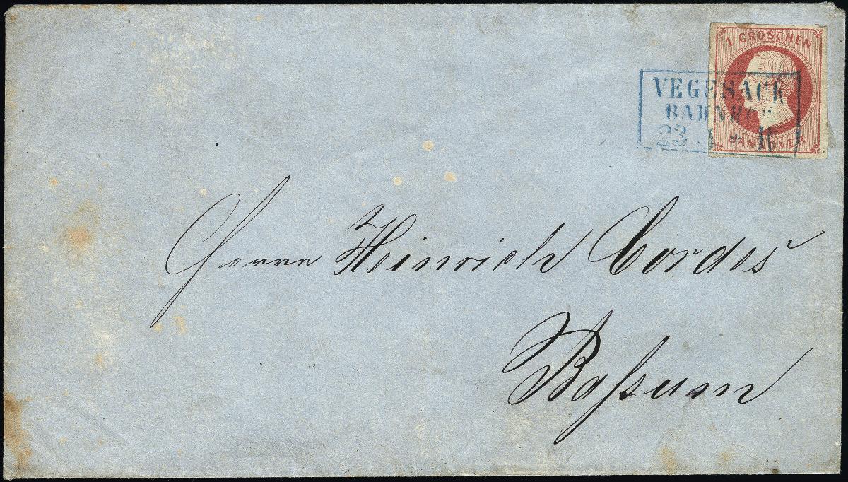 | Zusatzinformationen und Suchstichworte: | 377. Auktion Heinrich Köhler 20. - 25. September 2021 Los 9590 1859, Georg V. 1 Groschen rosa, farbfrisch und voll- bis breitrandig geschnitten mit Ra3 "VEGESACK BAHNHOF 23 4 * IV" auf Briefkuvert nach Bassum mit Ankunftsstempel, etwas altersfleckig, Marke teils Scherentrennung, der Umschlag einmal senkrecht gefaltet, ein seltener Stempel, Fotoattest Berger BPP (2007) Zuschlag 340,00 EUR |