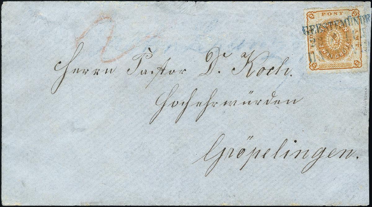 | Zusatzinformationen und Suchstichworte: | 377. Auktion Heinrich Köhler 20. - 25. September 2021 Los 9595 1866, 2 Grote gelborange, farbfrisch und gut gezähnt mit sauber aufgesetztem sowie übergehenden L3-Streckenstempel "GEESTEMÜNDE 23/ 11 HANNOVER" auf Briefkuvert mit etwas abgeschwächtem Aufgabevermerk "Wasserhorst" an die bekannte Adresse "Pastor Koch in Gröpelingen", rückseitig mit Transitstempel "BREMEN 23/11", oben links mit austaxiertem Landbestellgeld "2" in Rötel, gering altersfleckig, ein attraktiver und einzigartiger Beleg für die Verbindung zwischen diesen beiden Orten in den Bremer Außenbezirken, u.a. sign. Werner, Kurt Maier/Berlin sowie Fotoattest(kopie) Dr. Fischer BPP (1991) Zuschlag 1.700,00 EUR |