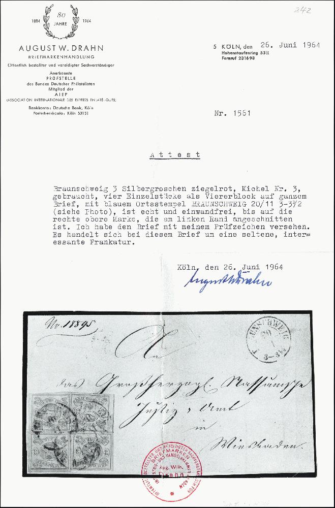 | Zusatzinformationen und Suchstichworte: | 377. Auktion Heinrich Köhler 20. - 25. September 2021 Los 9326 3 Silbergroschen orangerot, 4 Einzelwerte, ein Wert einseitig etwas angeschnitten, sonst alle breit- bis überrandig mit dreimal - wahrscheinlich aufgrund des Briefinhaltes - etwas unregelmäßig aufgesetztem blauen DKr. "BRAUNSCHWEIG 20/1" (1855) auf nicht ganz kompletter Briefhülle (untere Klappe fehlt) der 4. Gewichtsstufe an das Justiz-Amt in Wiesbaden mit rückseitigem Durchgangsstempel von Frankfurt und Ausgabestempel; einige senkrechte Briefbüge außerhalb der Frankatur nicht weiter störend. Eine der seltensten Frankaturen der 1. Ausgabe; wir haben keine weitere derartige Mehrfachfrankatur registriert. Sign. Drahn mit Attest (1964) und Fotoattest Lange BPP Zuschlag 5.200,00 EUR |