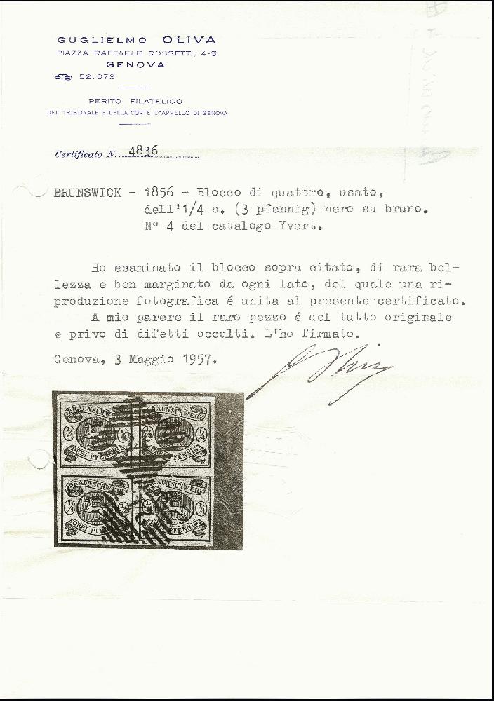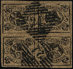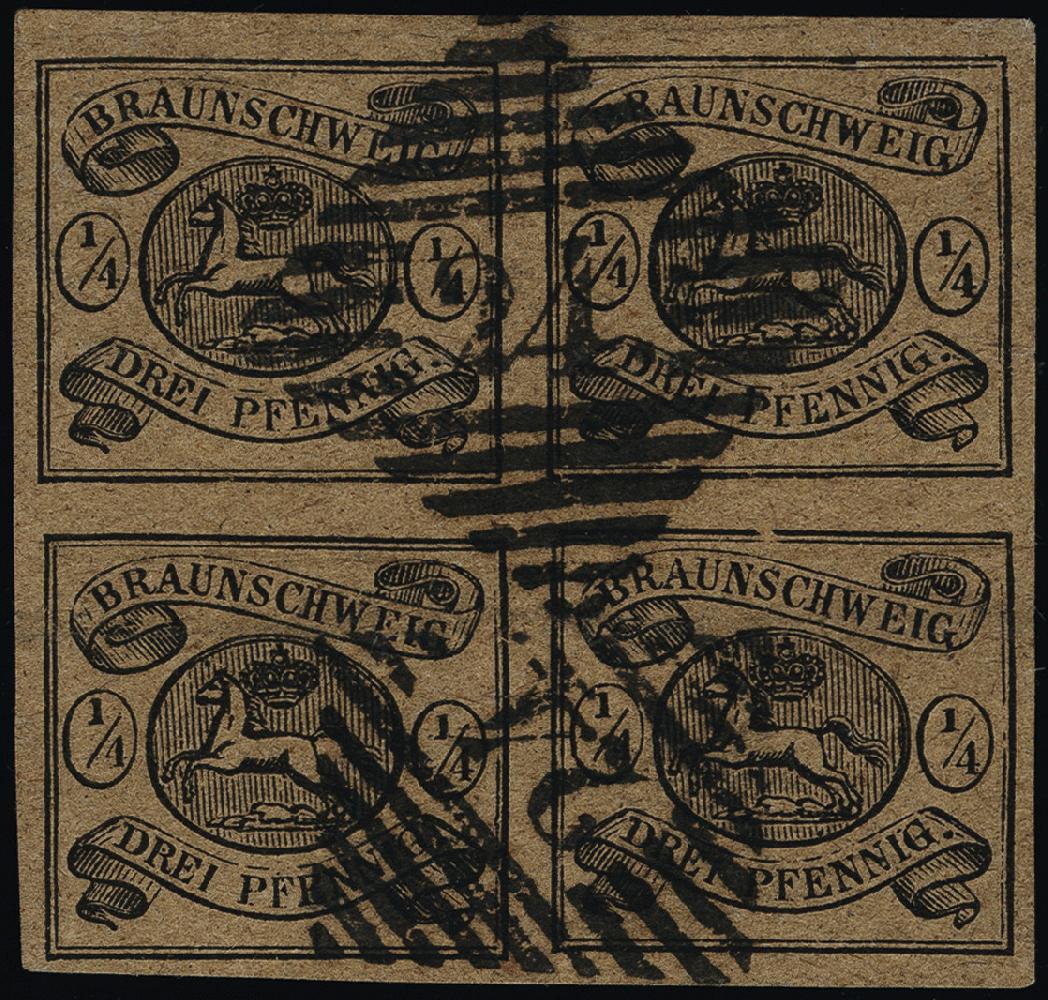 | Zusatzinformationen und Suchstichworte: | 377. Auktion Heinrich Köhler 20. - 25. September 2021 Los 9329 ¼ Ggr. auf braun im 4er-Block, farbfrisch und allseits breitrandig, sauber entwertet durch Nr. "24" HOLZMINDEN, Kabinett, sign. Emco, Oliva mit Fotoattest (1957) und Fotoattest Lange BPP (1995) Zuschlag 750,00 EUR |