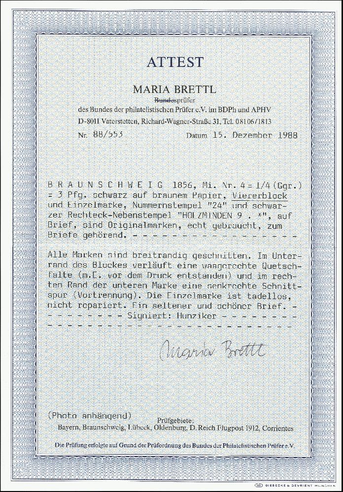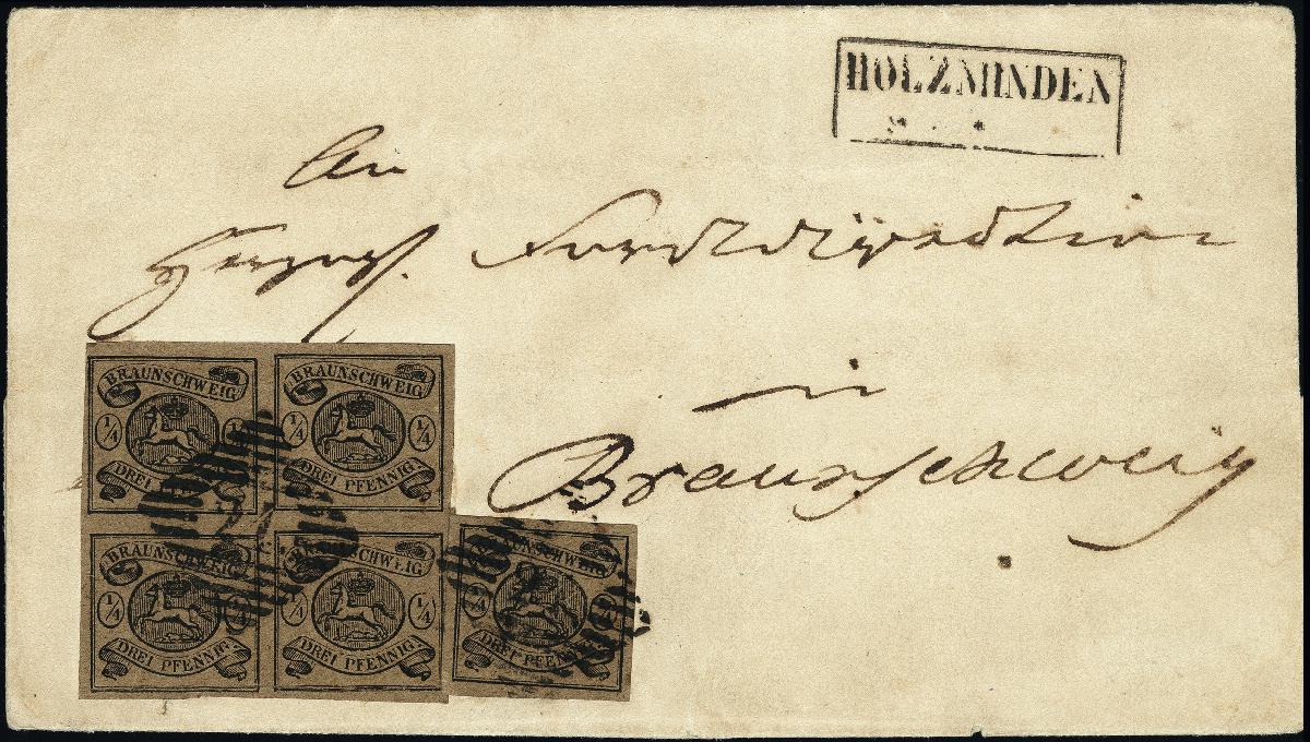 | Zusatzinformationen und Suchstichworte: | 377. Auktion Heinrich Köhler 20. - 25. September 2021 Los 9333 ¼ Gutegroschen auf braun, 4er-Block und Einzelmarke, alle voll- bis meist breitrandig, mit zweimal sauber aufgesetzter Nummer "24" auf Briefhülle von Holzminden nach Braunschweig; der 4er-Block zeigt am Unterrand eine herstellungsbedingte Druckfalte sowie rechts einen winzigen Vortrennschnitt. Ein außerordentlich attraktiver Brief in hervorragender Erhaltung, signiert Hunziker und Fotoattest Brettl BPP (1988) Zuschlag 3.000,00 EUR |