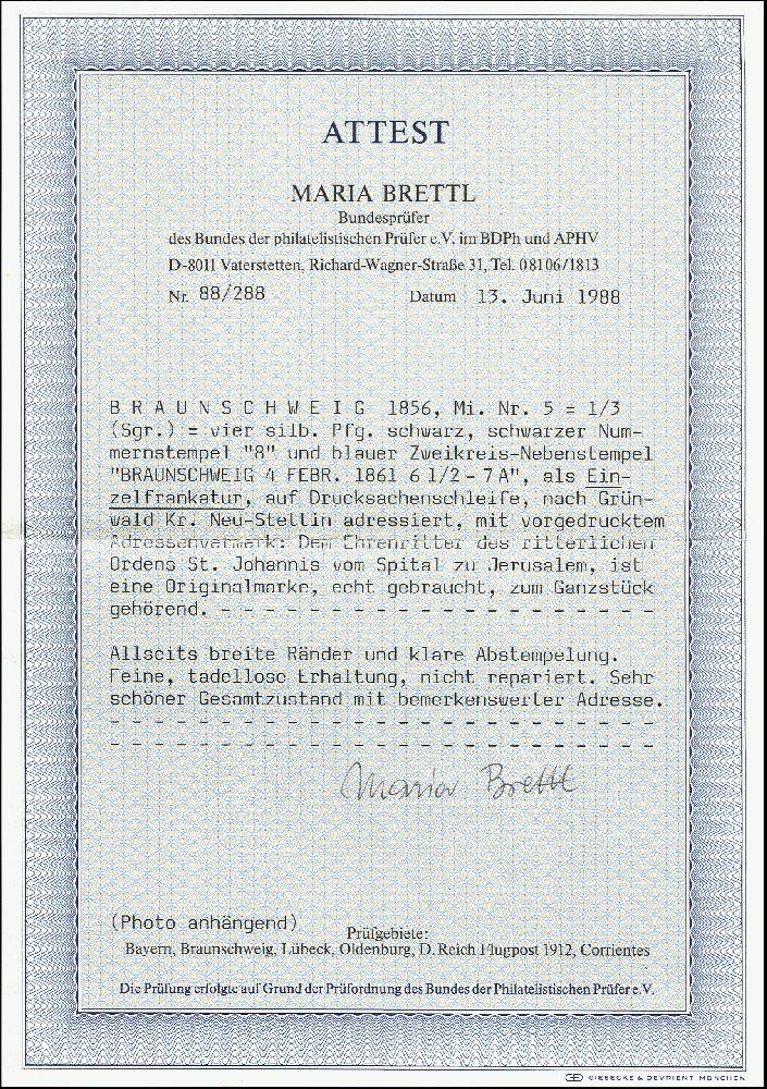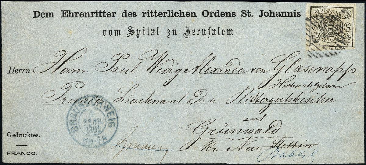 | Zusatzinformationen und Suchstichworte: | 377. Auktion Heinrich Köhler 20. - 25. September 2021 Los 9334 1/3 Silbergroschen schwarz, allseits sehr breitrandig geschnitten mit leicht und sauber aufgesetzter Nummer "8" und nebengesetztem blauen DKr. "BRAUNSCHWEIG 4 FEBR. 1861" auf vorgedrucktem Streifband "Dem Ehrenritter des ritterlichen Ordens St. Johannis vom Spital zu Jerusalem ..." nach Grünwald, Kreis Neu-Stettin. Sicherlich die schönste Einzelfrankatur dieser Marke, Fotoattest Brettl BPP Zuschlag 10.500,00 EUR |