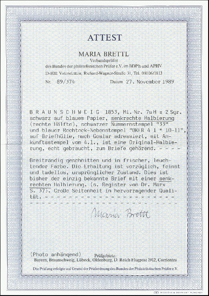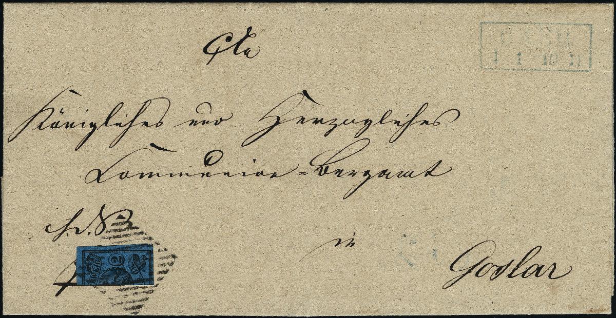 | Zusatzinformationen und Suchstichworte: | 377. Auktion Heinrich Köhler 20. - 25. September 2021 Los 9342 2 Silbergroschen auf blau, senkrecht halbiert, allseits breitrandig und farbfrisch mit klar und leicht aufgesetzter Nummer "33" auf aktenfrischer Briefhülle mit nebengesetztem Aufgabestempel "OKER 4 1" nach Goslar. Es sind nur 4 senkrechte Halbierungen dieser Marke bekannt, alle aus Oker, davon 2 auf Briefstücken sowie ein weiterer Brief mit zusätzlich ganzer 2 Silbergroschen-Marke. Eine in dieser Form einmalige Seltenheit in phantastisch frischer Erhaltung, Fotoattest Brettl BPP Zuschlag 36.000,00 EUR |