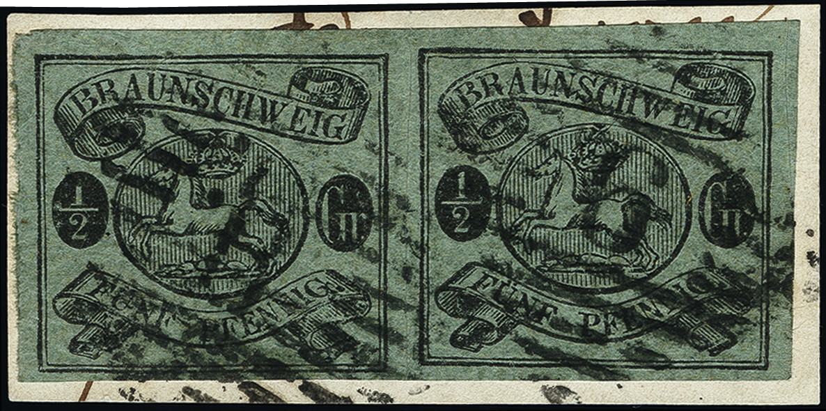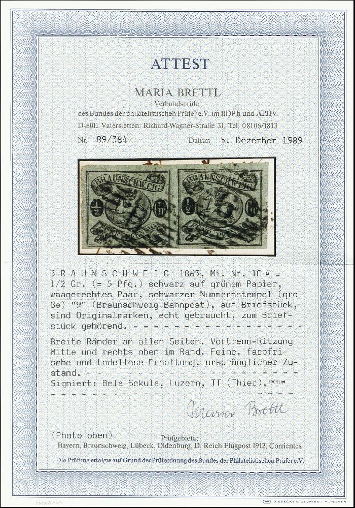 | Zusatzinformationen und Suchstichworte: | 377. Auktion Heinrich Köhler 20. - 25. September 2021 Los 9347 ½ Gr. auf grün, ursprüngliches waagerechtes Paar, zwischen den Marken vorgeritzt, farbfrisch und beide voll- bis breitrandig mit Nr. "9" (große Ziffer) auf Briefstück, tadellos, mehrfach sign. und Fotoattest Brettl BPP (1989) Zuschlag 300,00 EUR |