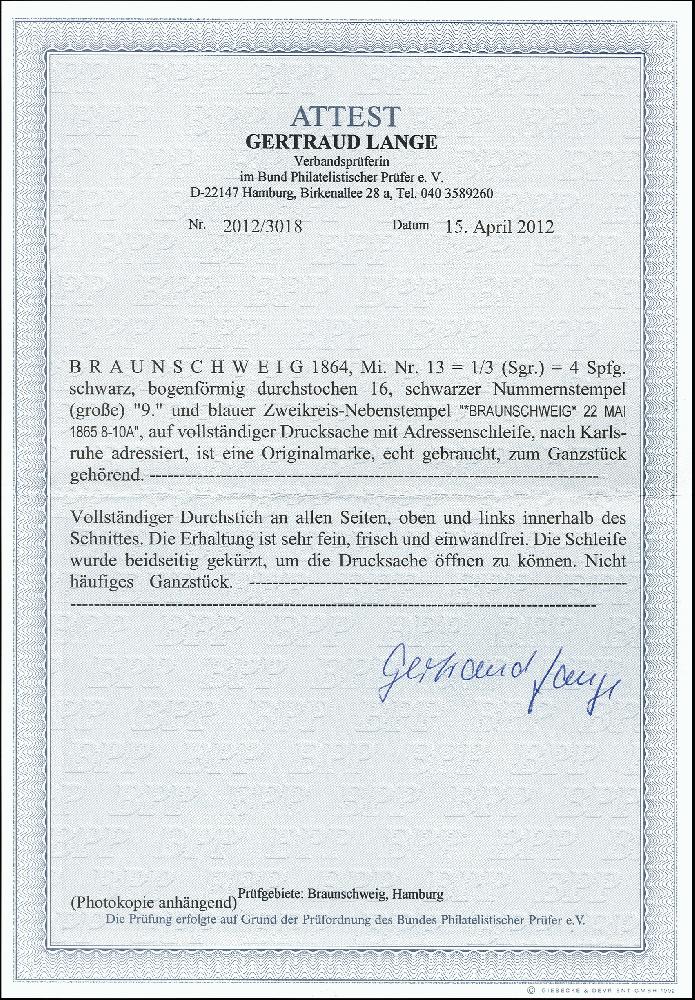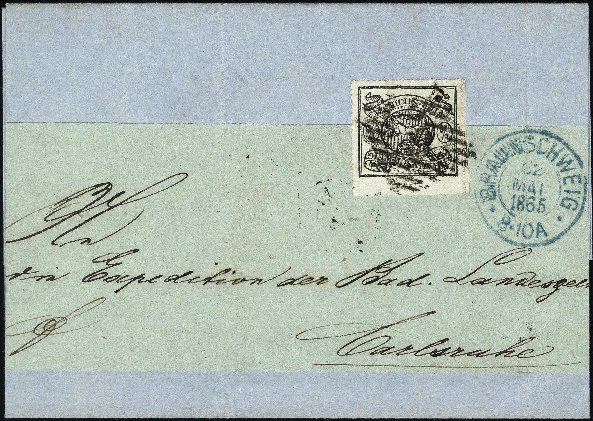 | Zusatzinformationen und Suchstichworte: | 377. Auktion Heinrich Köhler 20. - 25. September 2021 Los 9359 1/3 Silbergroschen schwarz, allseits tadellos durchstochen, oben und links mit Teilen von Nachbarmarken oder Bogenrand, mit Nummer "9" (große Type) und nebengesetztem DKr. "BRAUNSCHWEIG 22 MAI 1865" auf vollständiger Drucksache (Streifband nur vorderseitig komplett) nach Karlsruhe in Baden; eine der schönsten Einzelfrankaturen dieser seltenen und schwierigen Marke, Fotoattest Lange BPP Zuschlag 10.500,00 EUR |