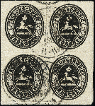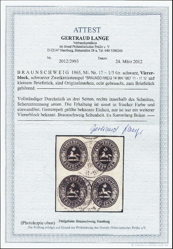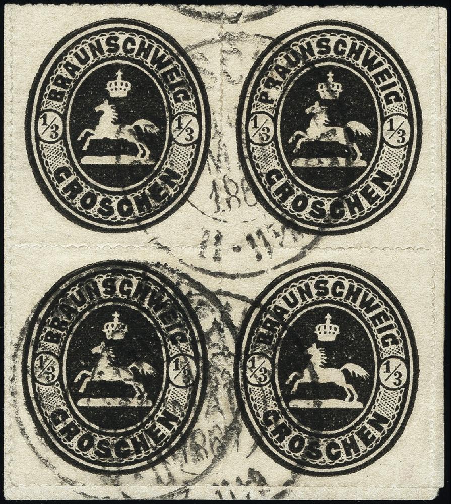| Zusatzinformationen und Suchstichworte: | 377. Auktion Heinrich Köhler 20. - 25. September 2021 Los 9366 1/3 Groschen schwarz im 4er-Block mit allseits erkennbarem Durchstich, dabei dreiseitig vollständig (rechts innerhalb einer Scherentrennung), unten im Durchstich Scherentrennung, mit DKr. "BRAUNSCHWEIG 14 MAI 1867" auf Briefstück, tadellose und frische Erhaltung. Es ist nur ein weiterer 4er-Block dieser Marke bekannt, jedoch in fehlerhafter Erhaltung. Liebhaberstück. Fotoattest Lange BPP Ausruf 3.000,00 EUR |
