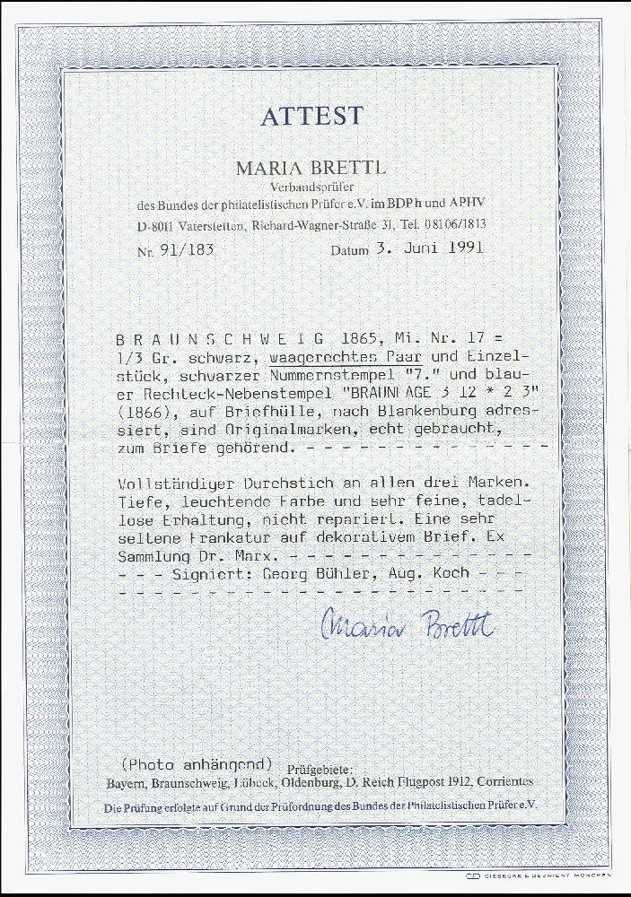 | Zusatzinformationen und Suchstichworte: | 377. Auktion Heinrich Köhler 20. - 25. September 2021 Los 9367 1/3 Silbergroschen schwarz, waagerechtes Paar und Einzelmarke, alle mit einwandfreiem Durchstich und farbfrisch, mit sauber aufgesetzter Nummer "7" auf Briefhülle mit nebengesetztem blauen Ra2 "BRAUNLAGE 3.12" nach Blankenburg; ein seltener und attraktiver Brief in tadelloser und ursprünglicher Erhaltung, Fotoatteste Bremer Kartei und M. Brettl BPP (1991) Zuschlag 8.500,00 EUR |