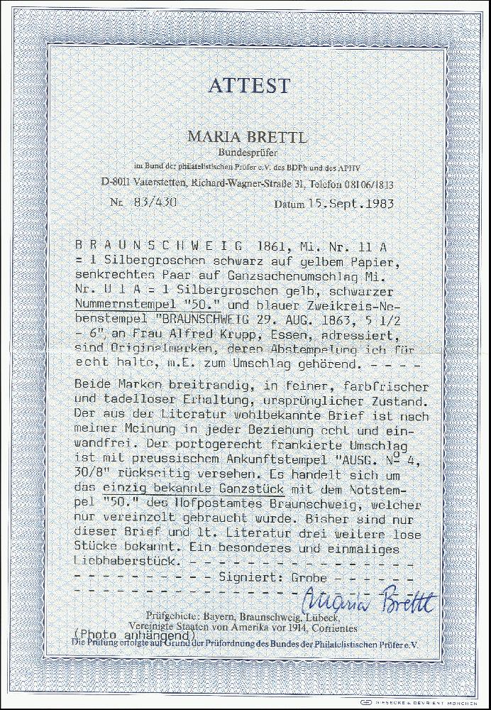 | Zusatzinformationen und Suchstichworte: | 377. Auktion Heinrich Köhler 20. - 25. September 2021 Los 9372 "50" BRAUNSCHWEIG der Aushilfsstempel des Bahnhofpostamtes, vollständig und glasklar abgeschlagen auf senkrechtem Paar 1861, 1 Silbergroschen gelb als Zufrankatur auf Ganzsachenumschlag 1 Silbergroschen gelb mit nebengesetztem blauen DKr. "BRAUNSCHWEIG 29 AUG. 1863" an die prominente Adresse "Alfred Krupp Gußstahlfabrik Essen a.d. Ruhr". Der Braunschweiger 'Notstempel' stellt eine der größten Stempelseltenheiten Altdeutschlands dar; seine Verwendung fällt genau in den Zeitraum zwischen spätester registrierter Verwendung der kleinen "9" und frühester bekannter der großen "9" des Bahnhofpostamtes. Neben diesem 1904 erstmals bekannt gewordenen Brief ist nur ein weiterer (vom 30.8.1863) sowie eine Handvoll Abschläge auf losen Marken bekannt geworden. Eine der größten Kostbarkeiten der Braunschweig-Philatelie, Fotoatteste Grobe (1955) und Brettl BPP (1983) Zuschlag 76.000,00 EUR |
