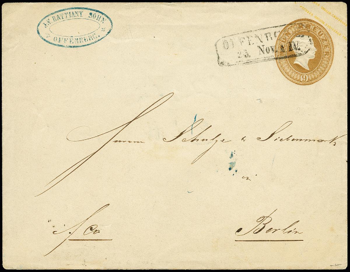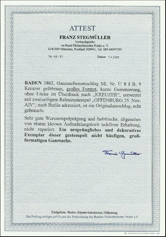 | Zusatzinformationen und Suchstichworte: | 367. Auktion Heinrich Köhler 25. - 29. September 2018 Los 2901 1862, Umschlag 9 Kr. gelbbraun im Großformat mit Ra2 "OFFENBURG 25 Nov." nach Berlin, außerhalb des Wertstempel kleines Aufnadelungsloch, sonst einwandfrei, Fotoattest Stegmüller BPP (2008) Ausruf 200,00 EUR |