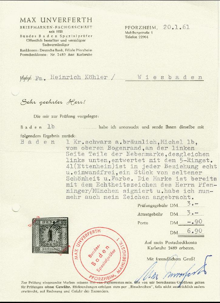 | Zusatzinformationen und Suchstichworte: | 367. Auktion Heinrich Köhler 25. - 29. September 2018 Los 2894 2. Auflage 1 Kr. auf bräunlich, allseits voll- bis überrandig mit Teilen von 3 Nachbarmarken und oben schmalem Bogenrand, leicht entwertet durch Nr. "41" ETTENHEIM, Kabinett, sign. Pfenninger und Unverferth, Fotobefund Stegmüller BPP Zuschlag 120,00 EUR |