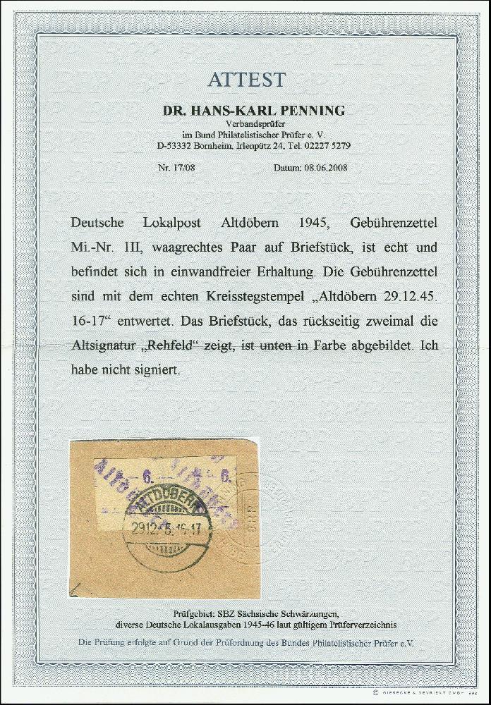 | Prüfgebiet: | Deutsche Lokalausgaben 1945 Altdöbern |