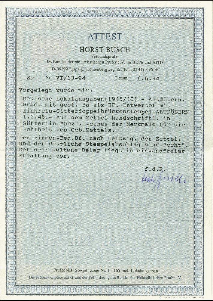 | Prüfgebiet: | Deutsche Lokalausgaben 1945 Altdöbern |