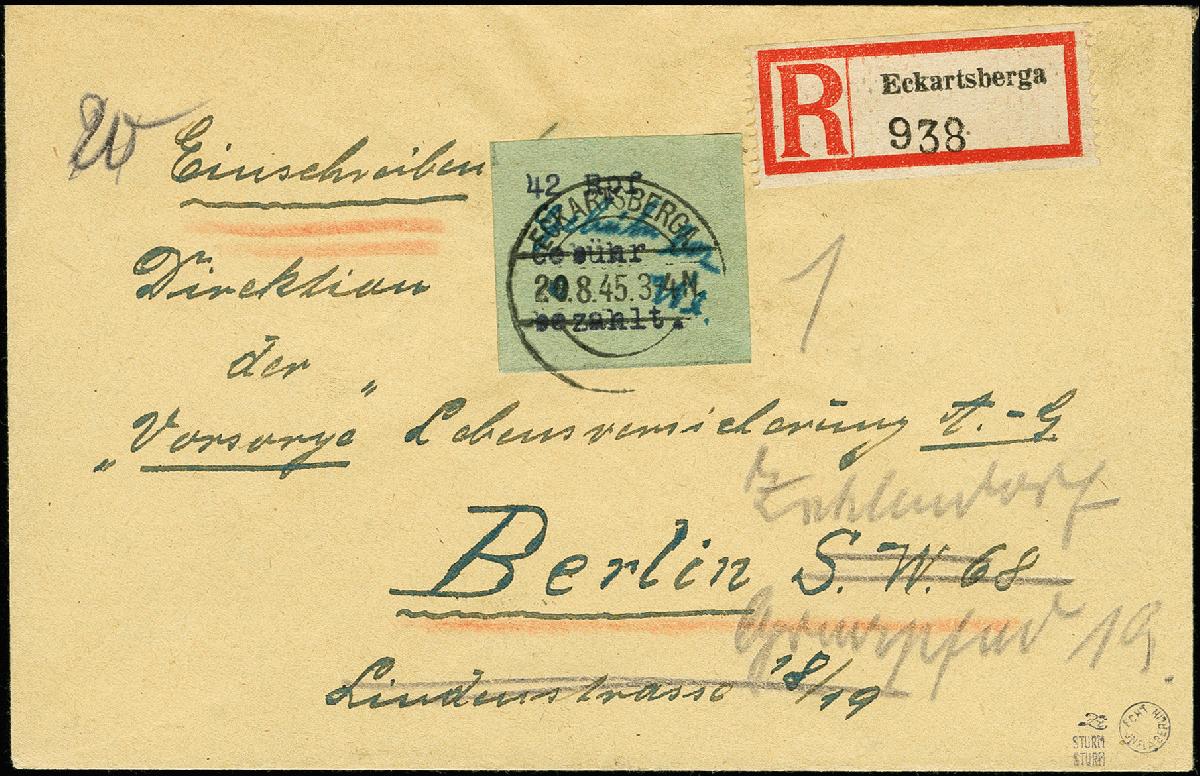 | Zusatzinformationen und Suchstichworte: | 367. Auktion Heinrich Köhler 25. - 29. September 2018 Los 1508 Gebührenzettel 42 Pfg. mit Signum "We" (Weidner) als portogerechte Einzelfrankatur auf R-Brief von "ECKARTSBERGA 20.8.45" an eine Berliner Versicherung mit Nachsendung nach Berlin-Zehlendorf mit entsprechenden Stempeln, Umschlag oben durch Umfalten um ca. 5 mm verkürzt, sonst in sehr guter Gesamterhaltung; einer der äußerst seltenen Bedarfsverwendungen aus Eckartsberga, doppelt sign. Sturm und ausführliches Fotoattest Kunz BPP (2011) Zuschlag 1.400,00 EUR |