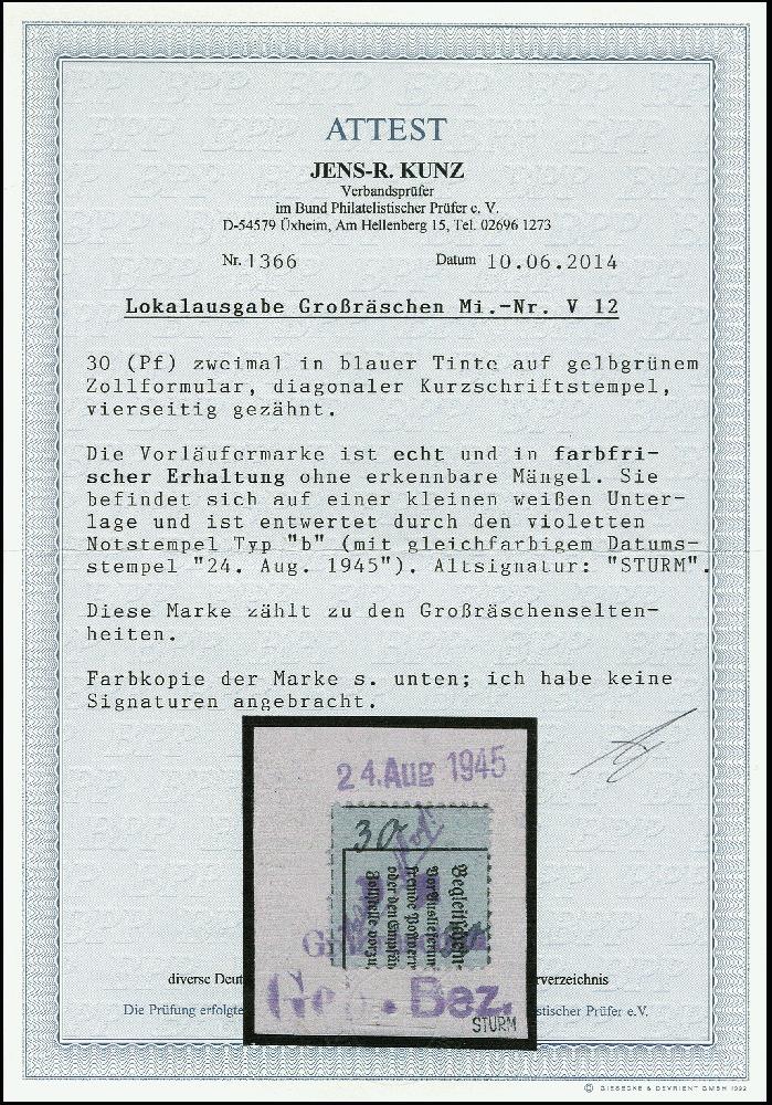 | Zusatzinformationen und Suchstichworte: | 367. Auktion Heinrich Köhler 25. - 29. September 2018 Los 1516 Zollformular 30 Pfg. schwarz auf gelbgrün mit Notstempeltype "b" und Datums-L1 "24.Aug.1945" auf Briefstück, tadellos, sign. Sturm und Fotoattest Kunz BPP (2014) (Mi. 500,-) Ausruf 150,00 EUR |