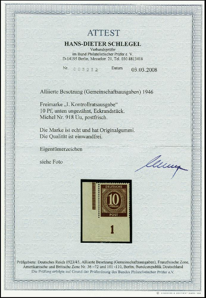| Zusatzinformationen und Suchstichworte: | 367. Auktion Heinrich Köhler 25. - 29. September 2018 Los 1548 10 Pfg. unten ungezähnt aus der linken unteren Bogenecke, postfrisch, tadellos, sehr selten, im Unterrand mit Eigentümerzeichen und Fotoattest D. Schlegel BPP (2008) (Mi. 1.500,-) Ausruf 400,00 EUR |