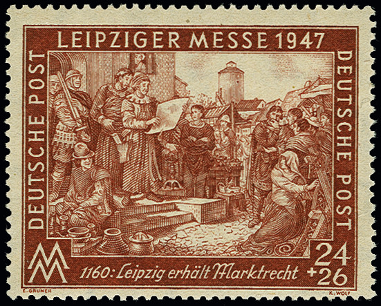 | Zusatzinformationen und Suchstichworte: | 367. Auktion Heinrich Köhler 25. - 29. September 2018 Los 1594 1947, Leipziger Frühjahrsmesse 24 Pfg. mit Wasserzeichen "Stufen flach steigend", ungebraucht, tadellos, signiert Schlegel BPP und Befund Schlegel BPP (2018) Zuschlag 150,00 EUR |