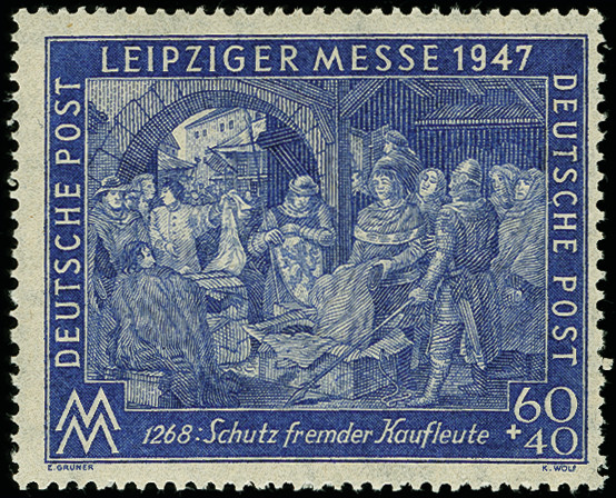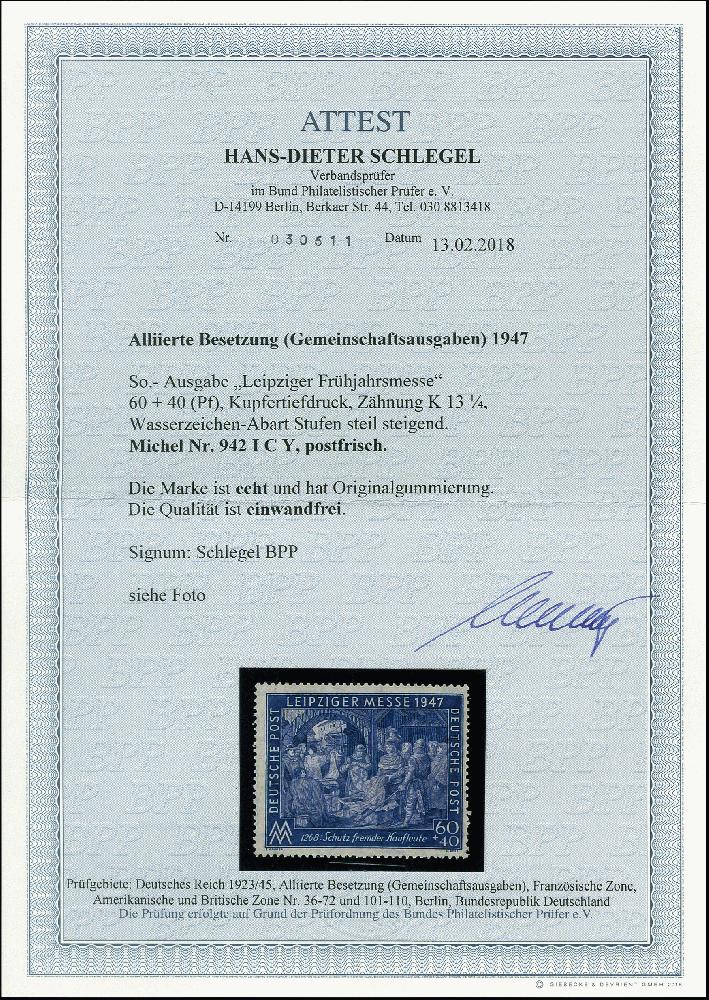 | Zusatzinformationen und Suchstichworte: | 367. Auktion Heinrich Köhler 25. - 29. September 2018 Los 1599 1947, Leipziger Frühjahrsmesse 60 Pfg. mit Wasserzeichen "Stufen steil steigend", postfrisch, tadellos, signiert Schlegel BPP und Fotoattest Schlegel BPP (2018) (Mi. 900,-) Zuschlag 140,00 EUR |