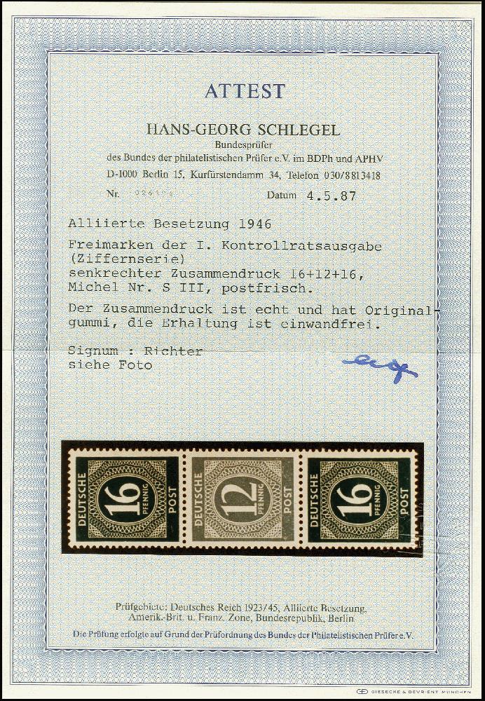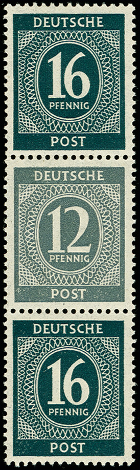 | Zusatzinformationen und Suchstichworte: | 367. Auktion Heinrich Köhler 25. - 29. September 2018 Los 1653 1946, senkrechter Zusammendruck 16 + 12 + 16 Pfg., postfrisch, tadellos, selten, sign. Richter und Fotoattest Schlegel BPP Zuschlag 450,00 EUR |
