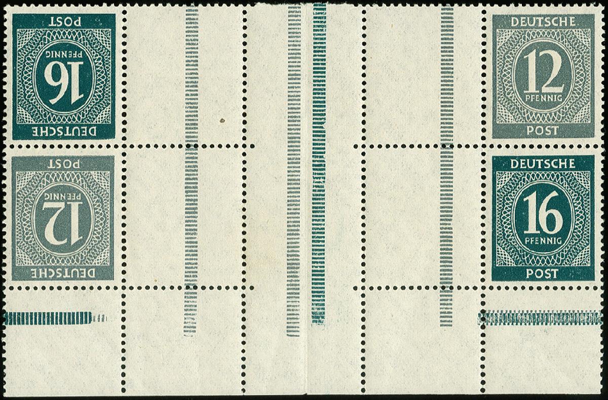 | Zusatzinformationen und Suchstichworte: | 367. Auktion Heinrich Köhler 25. - 29. September 2018 Los 1655 Kehrdruck-Zusammendruck 16 + Z + Z + 12 Pfg. und 12 + Z + Z + 16 Pfg. in einer Blockeinheit vom Unterrand, postfrisch mit Kalanderbügen, wie üblich im Steg gefaltet, sonst tadellos, äußerst seltene Einheit, unsigniert mit Fototattest Schlegel BPP (1987) Ausruf 2.000,00 EUR |