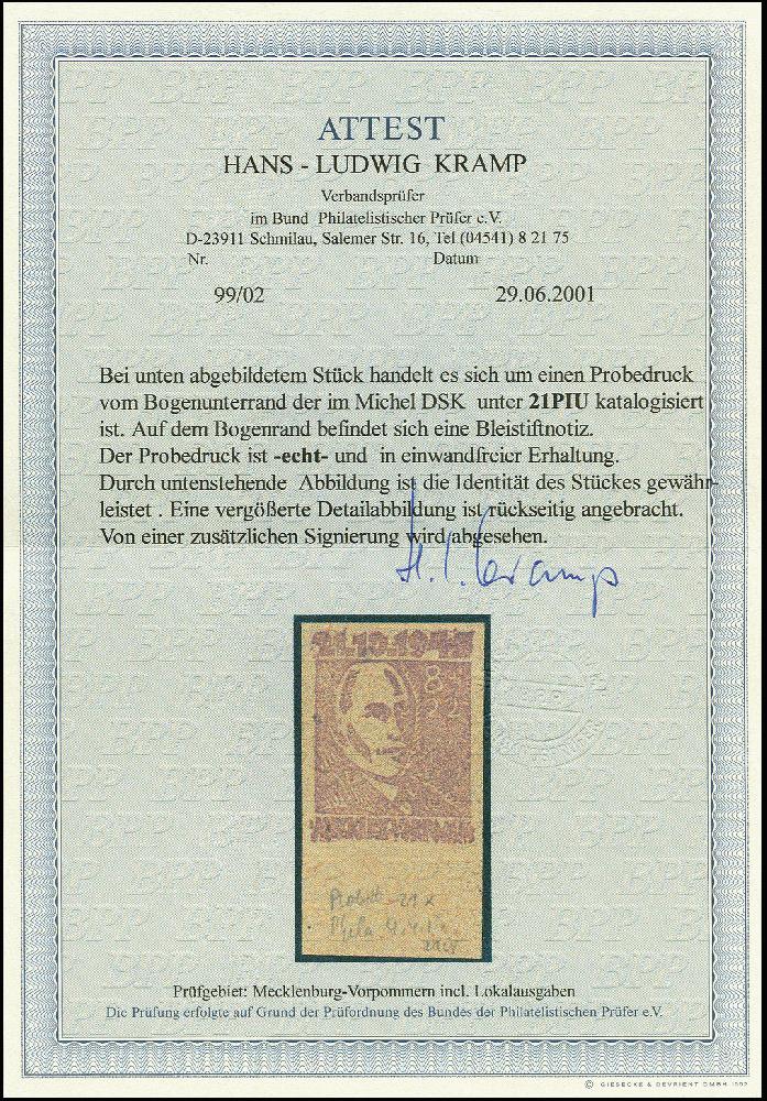 | Zusatzinformationen und Suchstichworte: | 367. Auktion Heinrich Köhler 25. - 29. September 2018 Los 1688 8 Pfg. ungezähnter Probedruck auf grauem, ungummiertem Papier, Unterrandstück in einwandfreier Erhaltung, Bleistiftbeschriftung unten sauber radiert, Fotoattest Kramp BPP (2001) (Mi. 750,-) Ausruf 200,00 EUR |