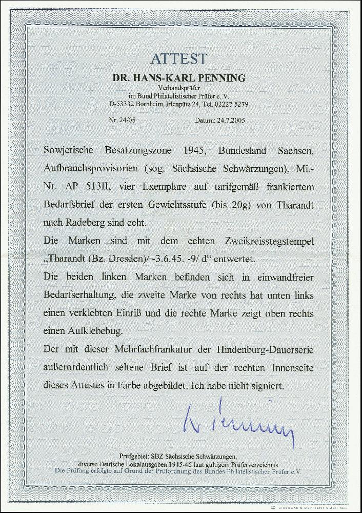| Zusatzinformationen und Suchstichworte: | 367. Auktion Heinrich Köhler 25. - 29. September 2018 Los 1727 OPD Dresden: 1945, Hindenburg 3 Pfg. mit Schwärzung, vier Einzelwerte als portogerechte Mehrfachfrankatur auf Brief von "THARANDT 3.6.45" nach Radeberg, Umschlag mit kleinen Randfehlern und zwei Werte mit Einriss bzw. Aufklebebug, trotz der Einschränkungen ein sehr seltene Frankatur, Fotoattest Dr. Penning BPP (2005) Zuschlag 250,00 EUR |