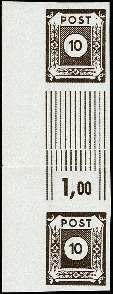 | Zusatzinformationen und Suchstichworte: | 367. Auktion Heinrich Köhler 25. - 29. September 2018 Los 1743 10 Pfg. schwarzsiena im senkrechten Zwischenstegpaar mit Bogenrand links, postfrisch mit üblicher Faltung im Steg, sonst tadellos, laut ausführlichem Fotoattest Ströh BPP (2011) sind bisher nur zwei Zwischenstegpaare bekannt (Mi. 5.500,-) Zuschlag 1.200,00 EUR |