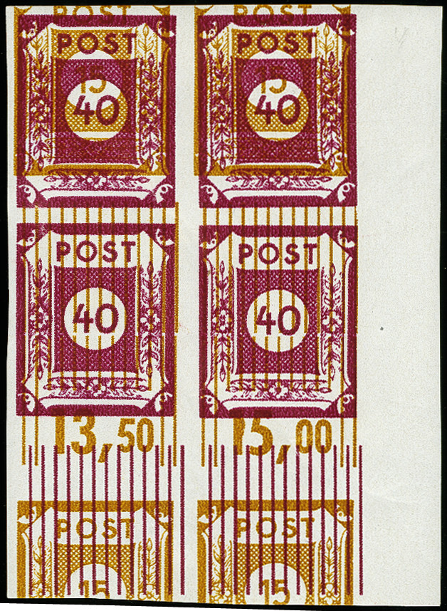 | Zusatzinformationen und Suchstichworte: | 367. Auktion Heinrich Köhler 25. - 29. September 2018 Los 1745 Doppeldruck 40 Pfg. auf 15 Pfg. dunkelgelbgelb im Eckrandviererblock, von der 15 Pfg. sind die beiden unteren Marke nur halb sichtbar, dafür sind die Strichelleisten oben und unten voll sichtbar, postfrisch, unsigniert mit Fotoattest Ströh BPP: "...in tadelloser Erhaltung" (2008, für Mi.-Nr. 50AIDDII) (Mi. ca. 880,-) Ausruf 200,00 EUR |