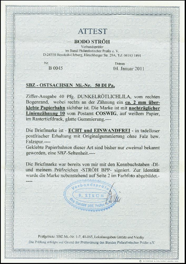 | Prüfer: | Ströh, Bodo (BPP (Bund Philatelistischer Prüfer)) |