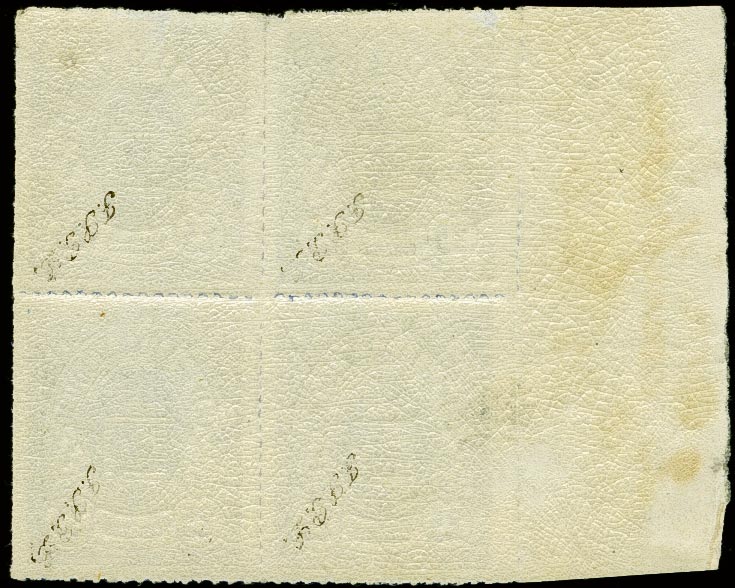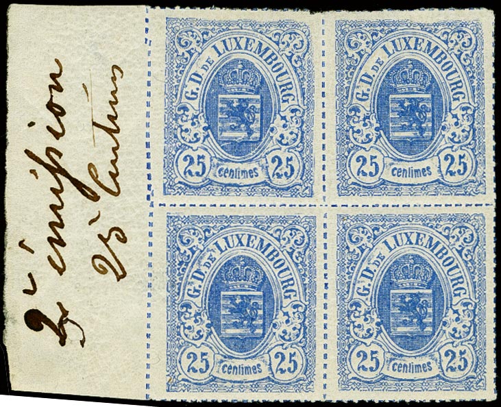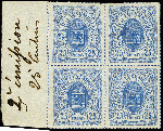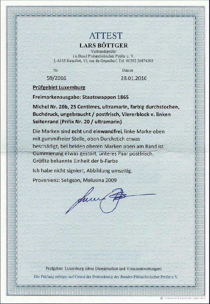 | Zusatzinformationen und Suchstichworte: | Erste Auflage, hellultramarin.Die obere linke Marke hat die seltene Variante, Strich unter der Pfote (die nur für die geschnittene Ausgabe katalogisiert ist), was den ohnehin seltenen Viererblock (einer der beiden bekannten in der Farbe ultramarin) einmalig macht. Da der zweite bekannte Viererblock im Auktionskatalog nur schwarzweiß abgebildet ist, kann hier nicht zwischen erster und zweiter Auflage unterschieden werden. Der Michel Katalog macht keinen Unterschied zwischen erster und zweiter Auflage. Für die Unterscheidung von erster und zweiter Auflage gibt es neue Erkenntnisse. Wer hier ins Detail gehen will sollte einen der wenigen Kenner auf dem Gebiet kontaktieren. Provenienz: Isac Seligson, Corinphila 68, 25.-30. Oktober 1982, Los 5318. |
