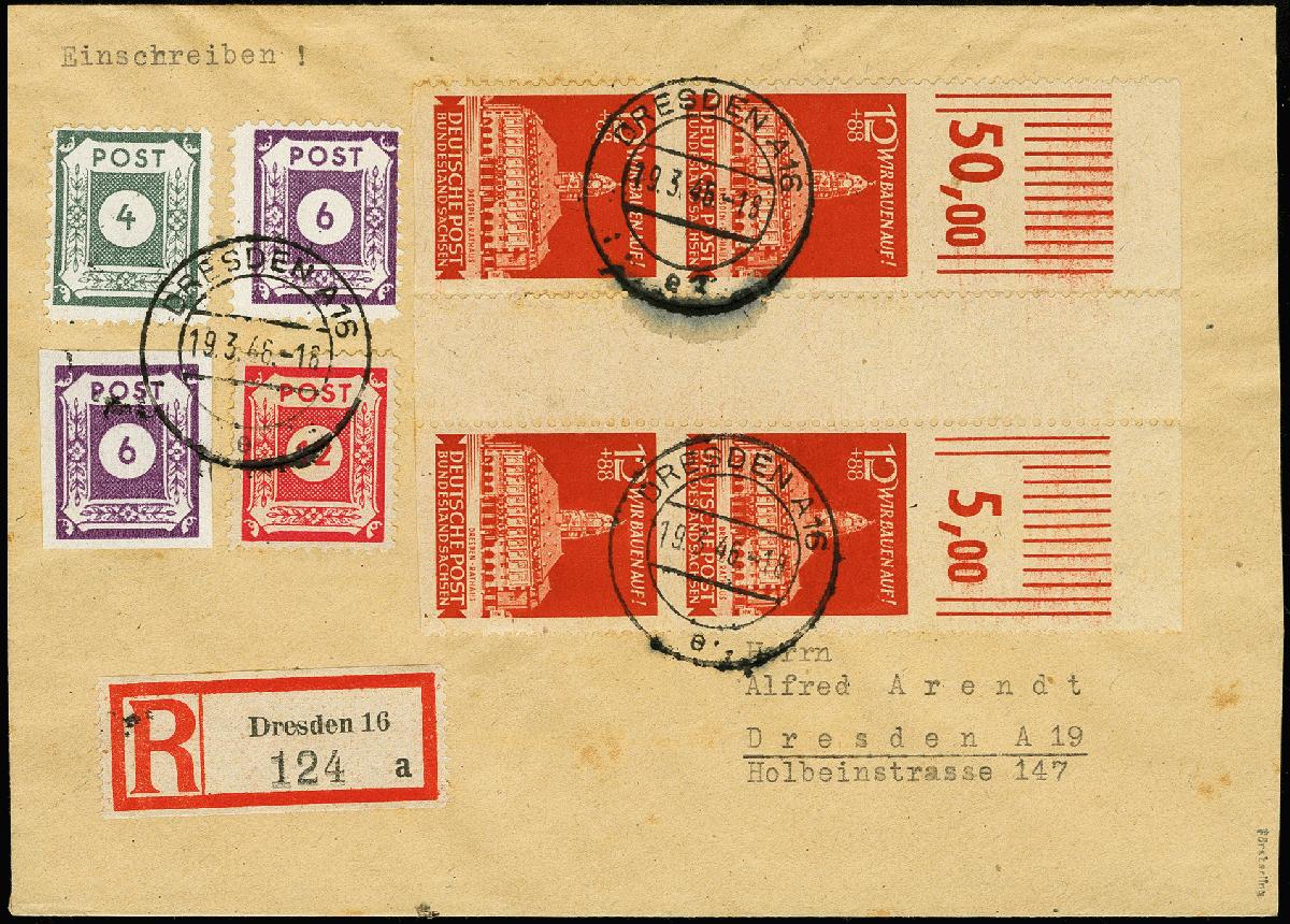 | Zusatzinformationen und Suchstichworte: | 367. Auktion Heinrich Köhler 25. - 29. September 2018 Los 1787 12 Pfg. dunkelorangerot waagerecht ungezähnt im waagerechten Zwischenstegpaar, zwei Stück in einer Oberrandeinheit und portogerechte Zufrankatur auf R-Ortsbrief aus "DRESDEN 19.3.46" mit Ankunftsstempel, Einheit links etwas fleckig, sonst in guter Gesamterhaltung, sehr seltene Verwendung, Fotoattest Ströh BPP (2012) (Mi. 3.900,-) Ausruf 500,00 EUR |