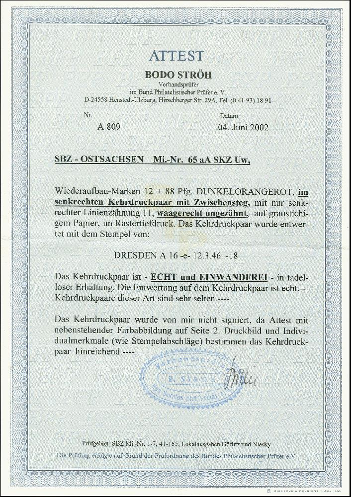 | Prüfer: | Ströh, Bodo (BPP (Bund Philatelistischer Prüfer)) |