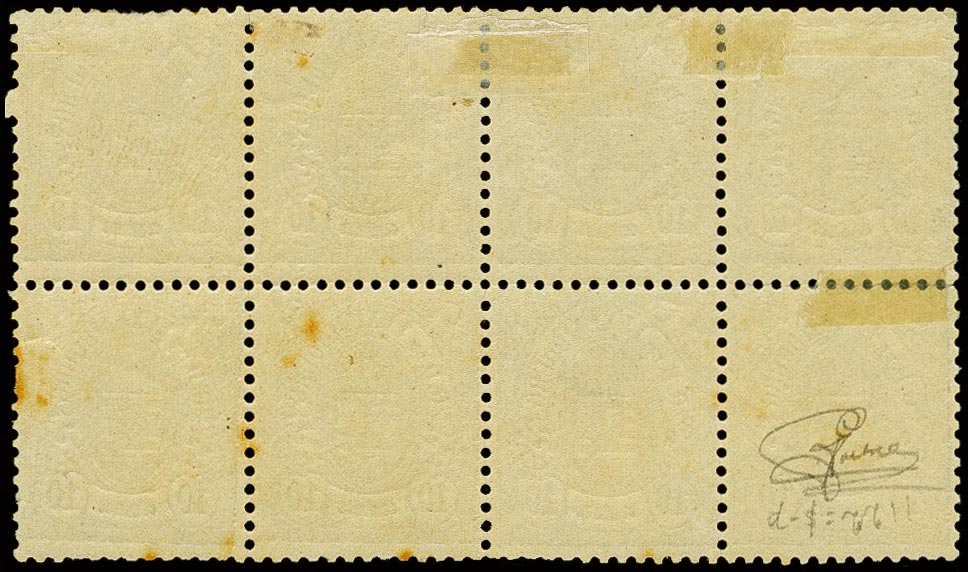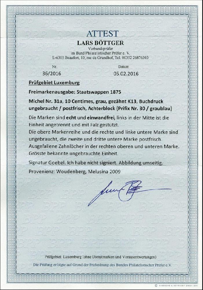 | Zusatzinformationen und Suchstichworte: | Provenienz: Sammlung Magonette, Willy Balasse 133, 06.12.1952, Los 1122. Sammlung Woudenberg, J.L. Van Dieten 420, 04-05.05.1967, Los 1239. Banque du Timbre A. Ungeheuer, 120, 12.02.1977, Los 214 (Titelbild). Soluphil 41, 17.07. 1989, Los 3051. Sammlung "M...E..." , Soluphil 24.10.2003, Los 1088. Sammlung Melusina, Soluphil 110, 20.02.2009, Los 1027. Heinrich Köhler 363, 21-24.09.2016, Los 625. Heinrich Köhler 365, 25-30.09.2017, Los 785. Rückseitig vermerkt, die Losnummer 1122 der Magonette Auktion. Der Block stammt vom rechten Bogenrand. |
