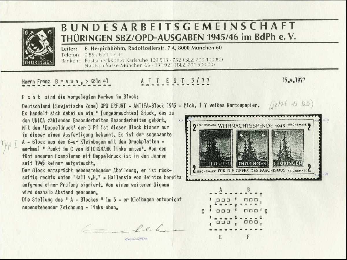 | Zusatzinformationen und Suchstichworte: | 367. Auktion Heinrich Köhler 25. - 29. September 2018 Los 1822 Antifa-Block auf weißem Papier, Type I mit Abart "3 Pfg. mit Doppeldruck", ungebraucht, tadellos, sehr seltene und dekorative Abart, sign. Hall v. H. und Fotoattest Herpichböhm (1977) (Mi. für postfrisch 10.000,-) Zuschlag 1.200,00 EUR |