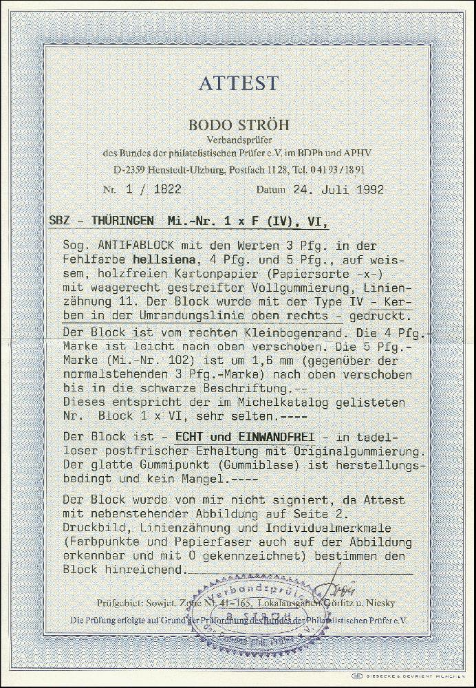 | Zusatzinformationen und Suchstichworte: | 367. Auktion Heinrich Köhler 25. - 29. September 2018 Los 1826 Antifa-Block auf weißem Papier, Type IV mit 3 Pfg. hellsiena und 5 Pfg.-Marke um 1,6 mm nach oben verschoben (4 Pfg. leicht verschoben), postfrisch, sehr seltene Variante, unsigniert mit Fotoattest Ströh BPP: "...in tadelloser Erhaltung" (1992) für Bl. 1xF VI (Mi. 3.500,-) Zuschlag 720,00 EUR |