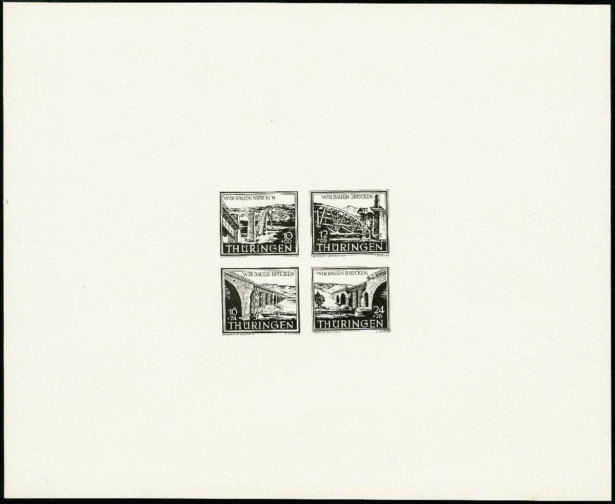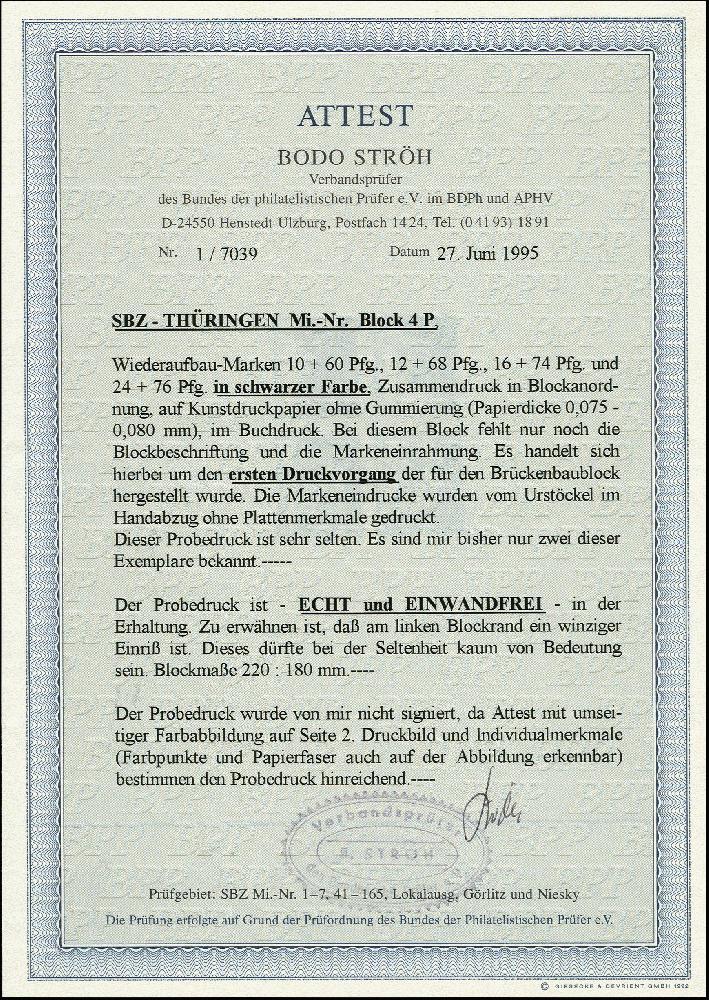 | Zusatzinformationen und Suchstichworte: | 367. Auktion Heinrich Köhler 25. - 29. September 2018 Los 1852 Probedruck Wiederaufbau-Block im Schwarzdruck ohne Blockbeschriftung auf Kunstdruckpapier ohne Gummierung im Format 220x180 mm, am linkem Rand mit winzigem Einriss, sonst tadellos, sehr selten, bisher sind nur wenige Exemplare bekannt, Fotoattest Ströh BPP (1995) (Mi. 7.000,-) Zuschlag 1.800,00 EUR |