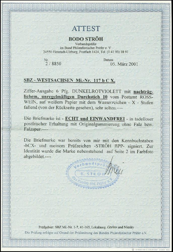 | Zusatzinformationen und Suchstichworte: | 367. Auktion Heinrich Köhler 25. - 29. September 2018 Los 1862 Roßwein mit Durchstich 10: 6 Pfg. dunkelrotviolett mit Wasserzeichen 1 X, postfrisch, sehr seltene Marke, sign. Ströh BPP mit Fotoattest: "...in tadelloser postfrischer Erhaltung" (2001) (Mi. 5.000,-) Zuschlag 1.000,00 EUR |