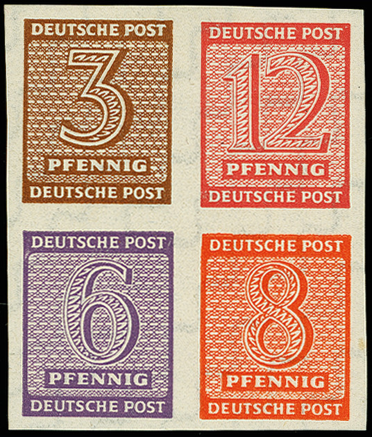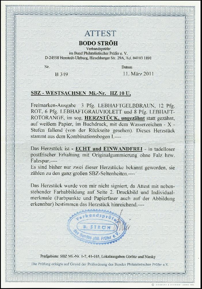 | Zusatzinformationen und Suchstichworte: | 367. Auktion Heinrich Köhler 25. - 29. September 2018 Los 1874 Herzstück 3/8 Pfg. ungezähnt, postfrisch, tadellos, unsigniert, laut ausführlichem Fotoattest Ströh BPP (2011) sind bisher nur zwei Exemplare bekannt, einer der ganz großen SBZ-Seltenheiten (Mi. 8.000,-) Zuschlag 2.400,00 EUR |