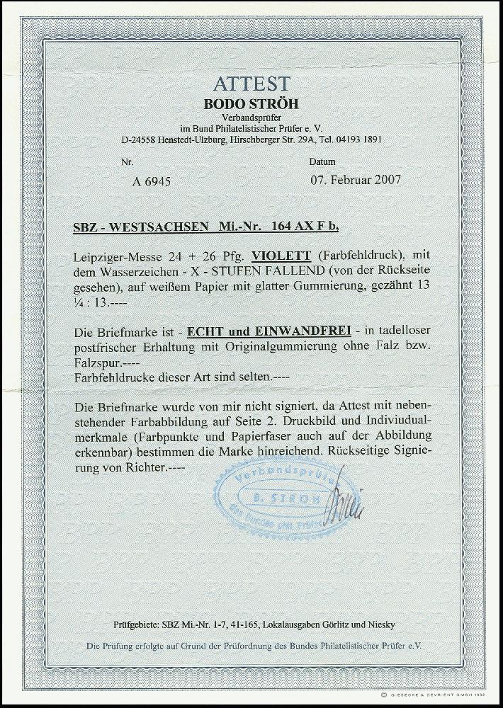| Prüfer: | Ströh, Bodo (BPP (Bund Philatelistischer Prüfer)) |