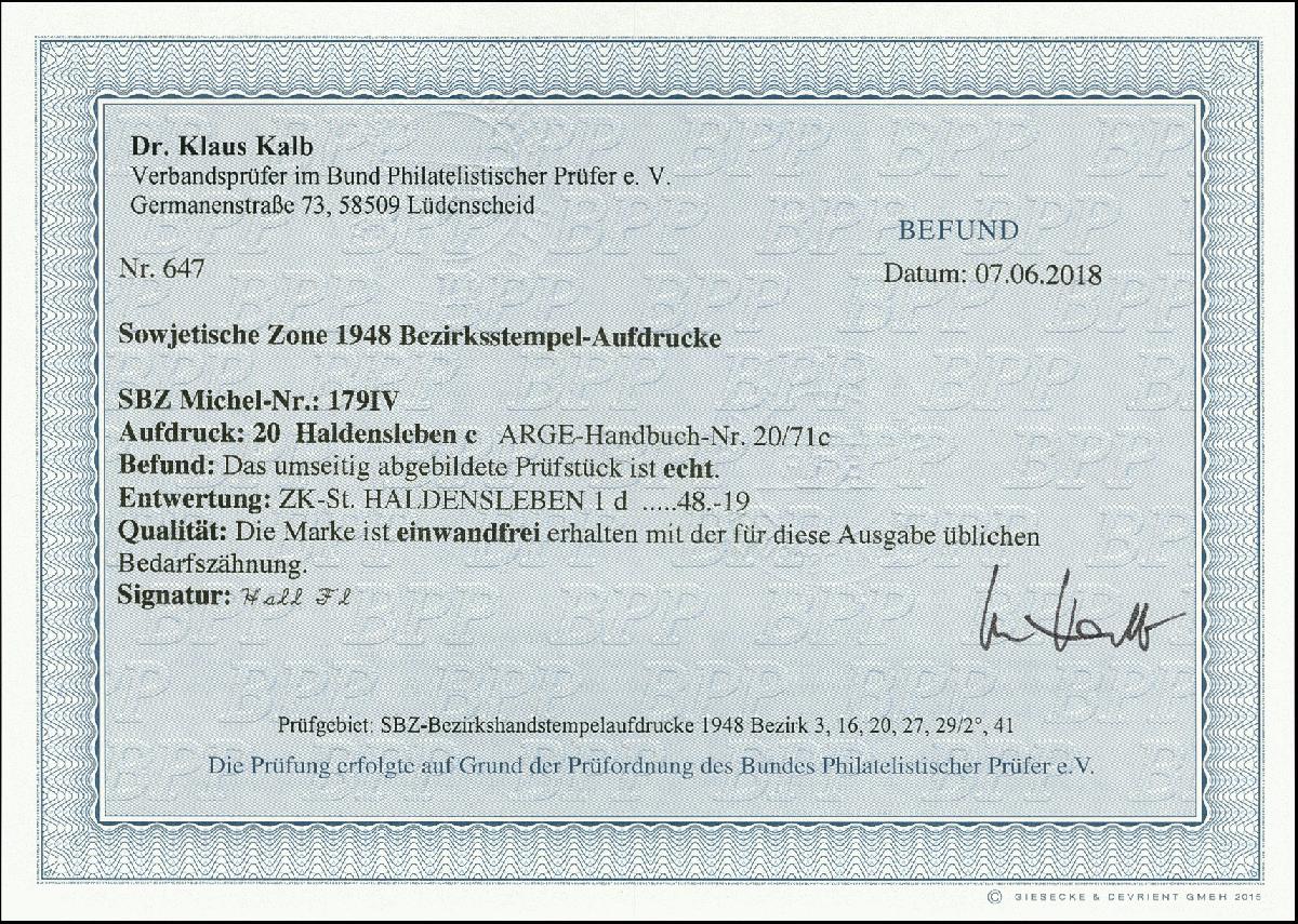 | Prüfer: | Kalb, Klaus (BPP (Bund Philatelistischer Prüfer)) |
