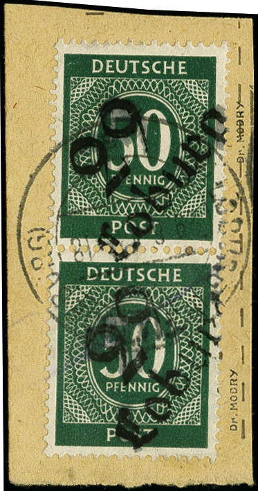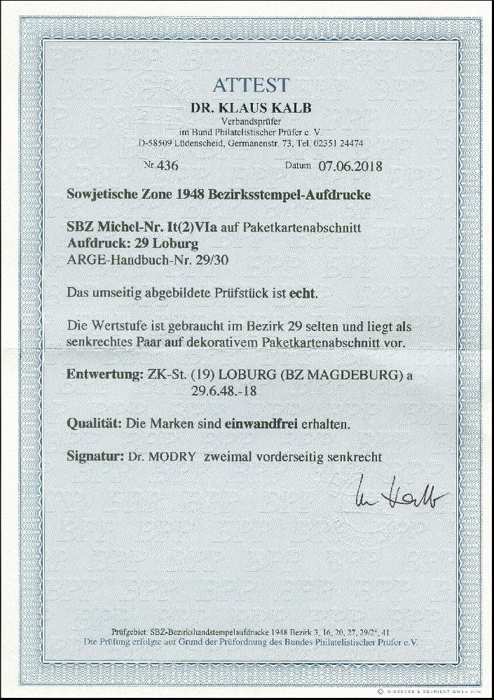 | Zusatzinformationen und Suchstichworte: | 367. Auktion Heinrich Köhler 25. - 29. September 2018 Los 1892 "29 Loburg" auf Ziffer 50 Pfg., senkrechtes Paar, gestempelt "LOBURG 29.6.48" auf Paketkartenabschnitt, tadellos, sign. Dr. Modry, Fotoattest Dr. Kalb BPP (2018) (Mi. 900,-) Ausruf 200,00 EUR |